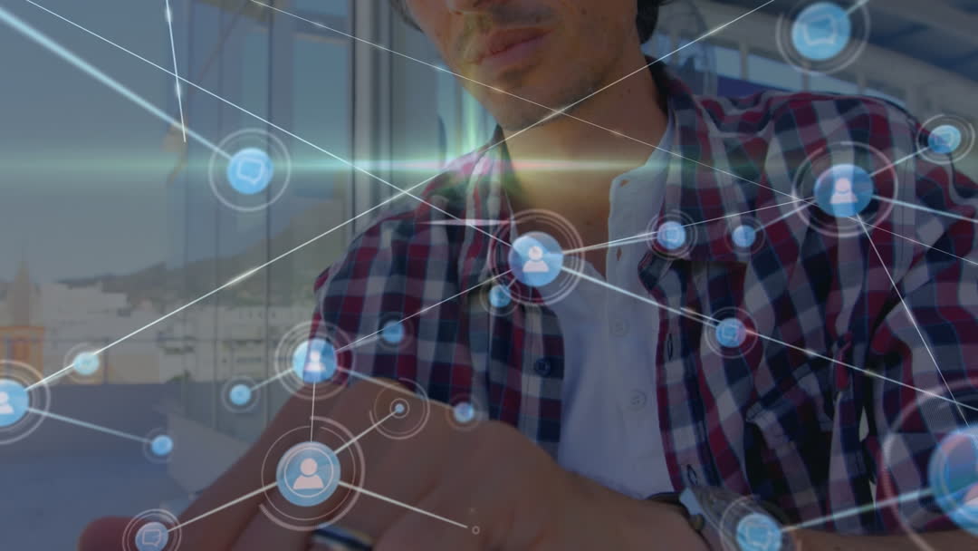 This depicts a caucasian man engrossed with digital network icons overlay, symbolizing global connection and innovation. Ideal for highlighting themes like digital networking, technological advancements, remote communication, and modern connectivity solutions, useful for marketing materials, technological content, or educational resources related to IT or telecommunications.