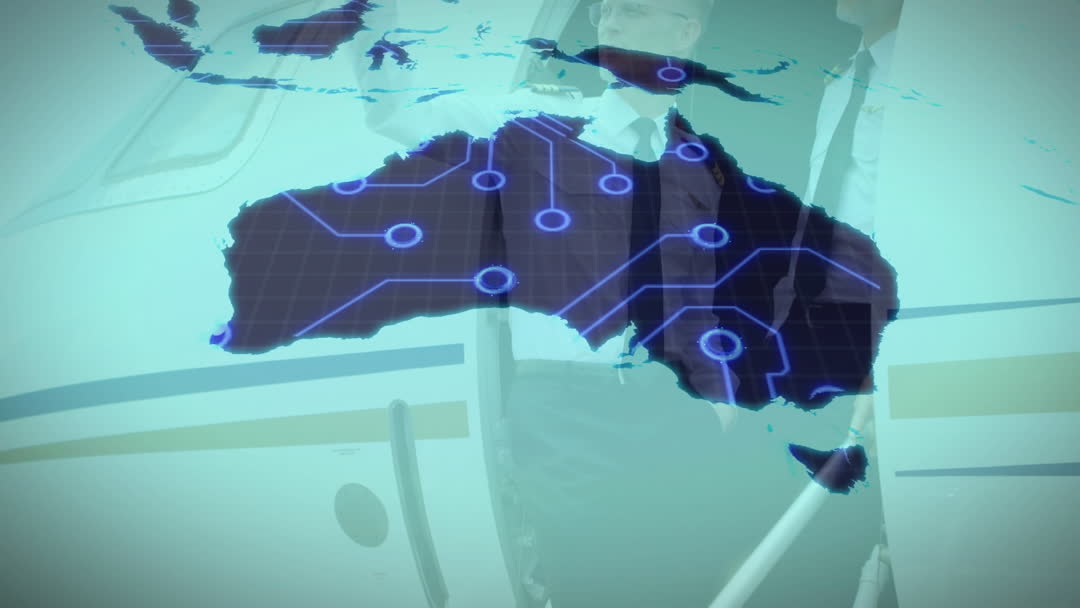 Visual depicting technological advancements in aviation, featuring digital connections overlaying Australia's map on a pilot exiting aircraft. Use this video to emphasize themes of modern travel, innovation in airlines, or technology integration in aviation industry advertisements and presentations.