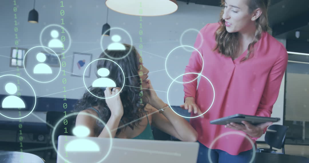 Two business professionals collaborate in a modern office environment, immersed in digital technology and networking concepts. Icons of digital personas and binary coding overlay their interaction, symbolizing connectivity and the fast-paced realms of data and communication. This visual represents themes of modern collaboration, innovation in business processing, and digital connectivity. It is suitable for use in presentations on tech-driven entrepreneurship, articles focusing on digital transformation in business, or marketing materials promoting digital solutions.