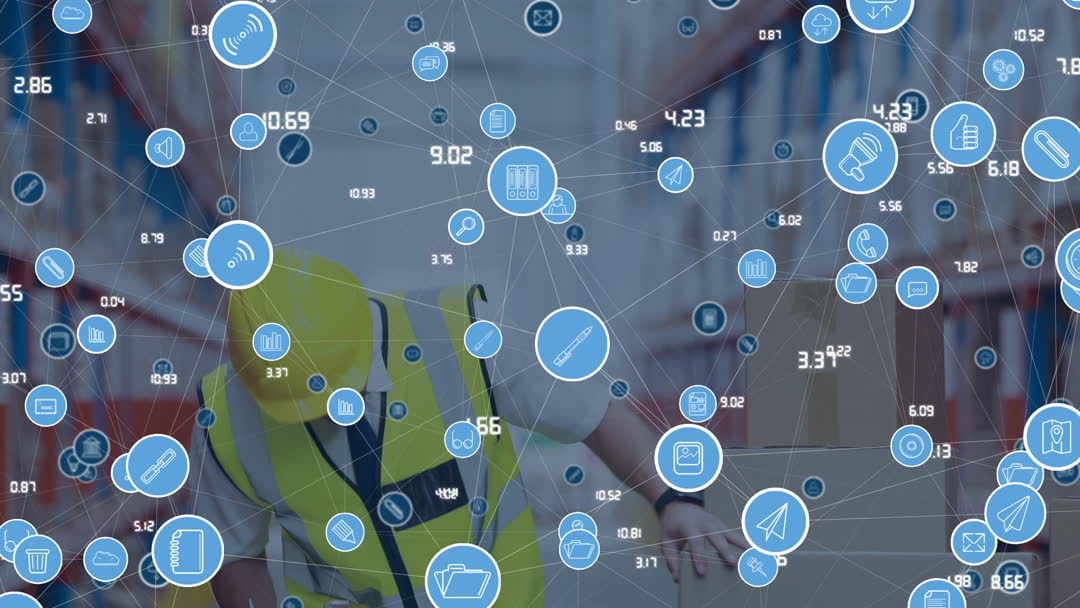 Warehouse worker with digital connections overlay representing modern logistics and global shipping processes. Ideal for use in content about automation technology in logistics, supply chain improvements, and integration of digital networks in business operations.