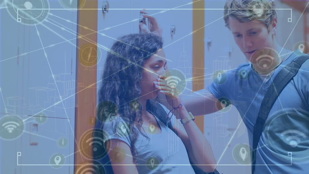 The video shows two students interacting in a school corridor with an overlay of digital network connections. Symbolic elements such as Wi-Fi icons and interconnected lines highlight the theme of technology in education. This visual is ideal for depicting the integration of digital advancements in educational environments or campaigns focused on futuristic classrooms and connectivity in learning.