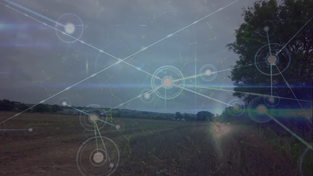 Digital Connections Overlay on Rural Countryside Landscape Video