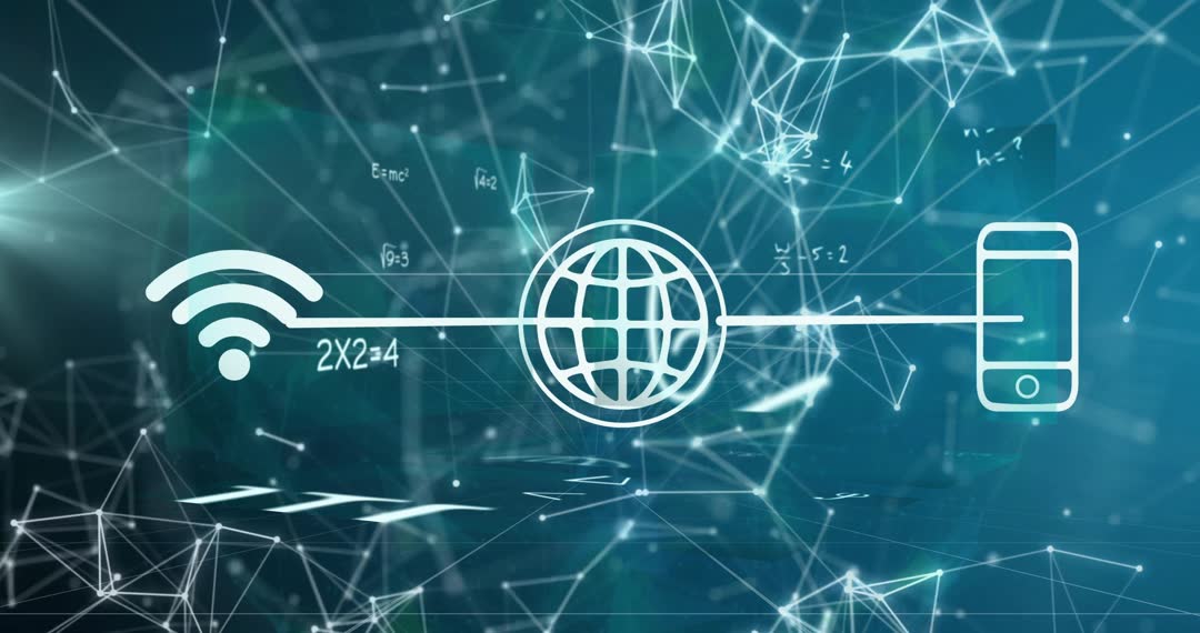 Abstract representation of digital connectivity features WiFi, globe, and smartphone icons, illustrated with equations and flowing data lines against a teal geometry-infused backdrop. Perfect for visuals conveying concepts of technological innovation, telecommunication, cyber infrastructure, and interconnected global communications systems. Useful in presentations, websites, or promotional material focused on modern solutions in digital networking and data technology.