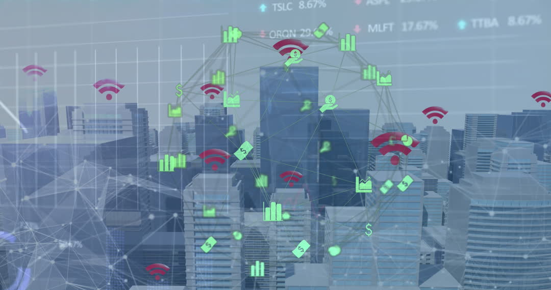 Depicts integration of digital networks and technology into urban environments, illustrating concepts of modern connectivity and real-time financial data transmission. Useful for tech events, financial analysis promotions, or illustrating smart city discussions.