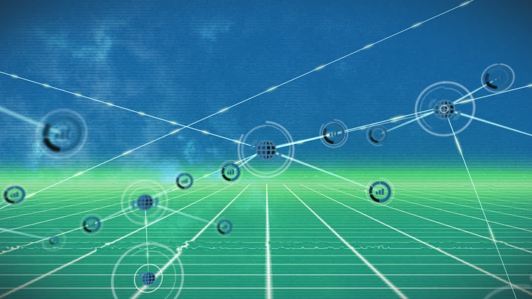 This video presents a digital animation illustrating the interconnectedness of technology and communication. The holographic network of digital icons is set against a green grid and blue backdrop, evoking themes of global networking and business technology innovation. Ideal for use in technology articles, digital communication resources, or global network presentations.
