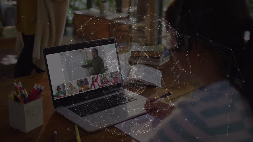 Network of connections overlays a laptop while a user is engaged in a virtual meeting, emphasizing technology and modern digital communication. Ideal for illustrating concepts like remote work, global communication, or networking in a modern office environment.