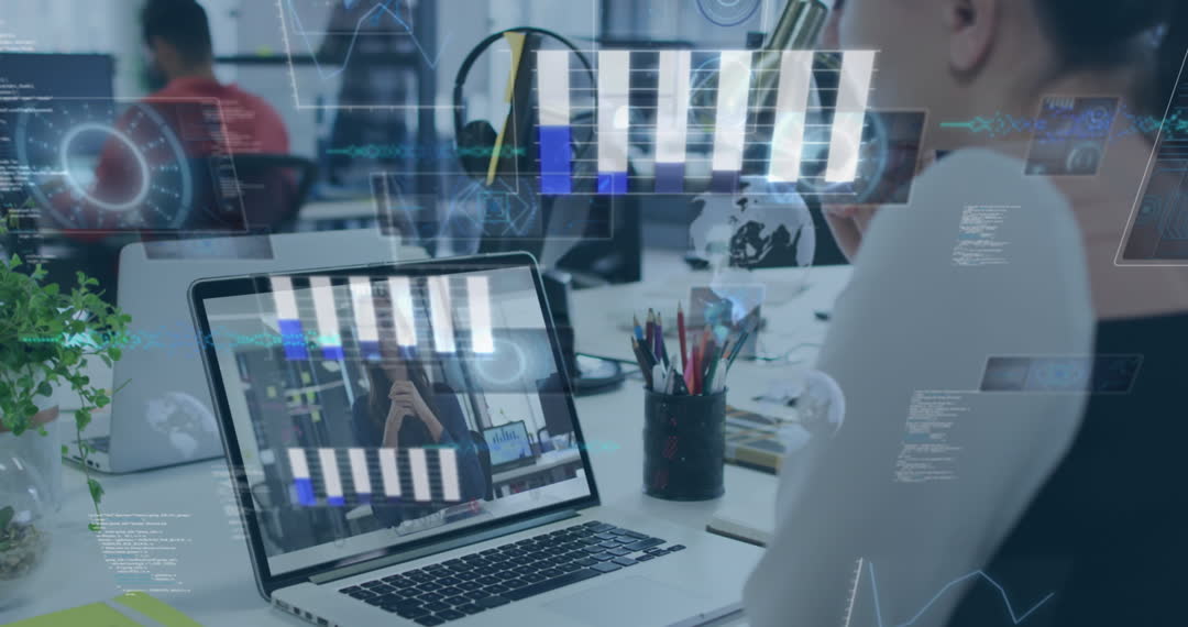 Woman participating in a video call with a colleague on a laptop in an office environment, with digital interface elements overlayed. Ideal for portraying modern business communication and digital connectivity. Useful for articles or presentations about remote work, global connections, and technological advancements in business settings.