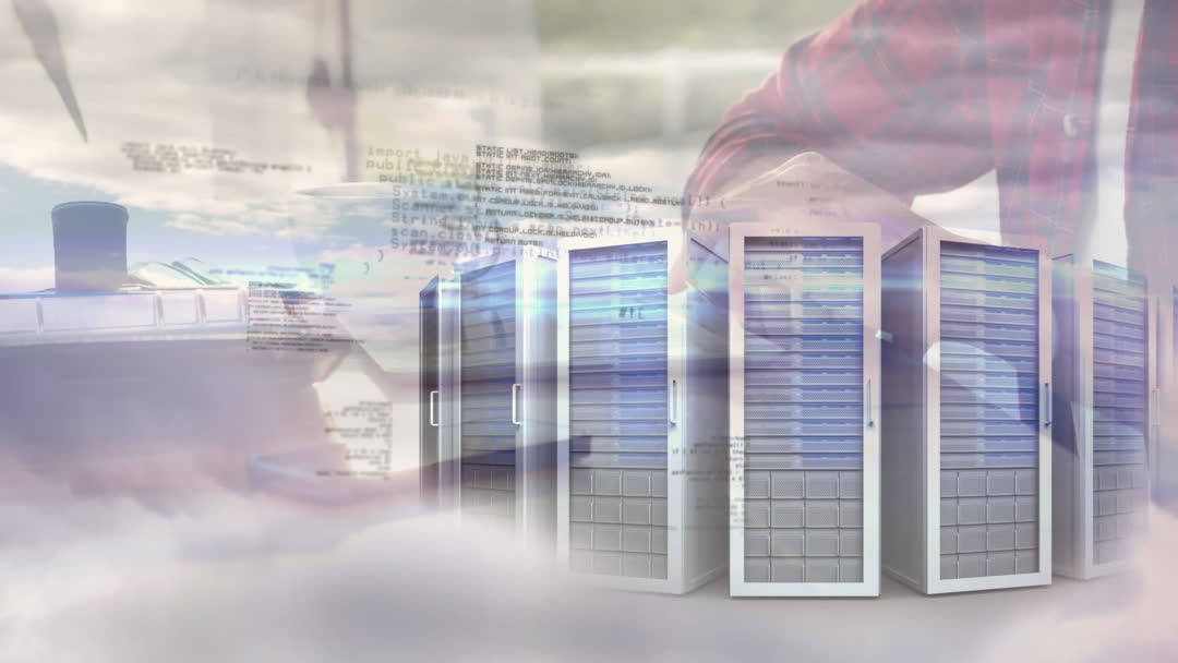 Digital montage evidencing interconnectedness of cloud computing and networking solutions through blending elements of servers, coding, and tablets. Useful for illustrating articles or presentations related to advancements in technology, digital infrastructure trends for businesses, or modern network solutions enhancing digital workspaces.