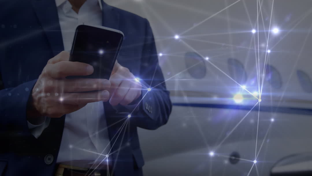Visual illustrates seamless global connectivity with technology in modern business travel context. Useful for illustrating themes of digital communication, business travel logistics, and global connections in presentations, marketing materials, or articles on technology in the corporate sector.