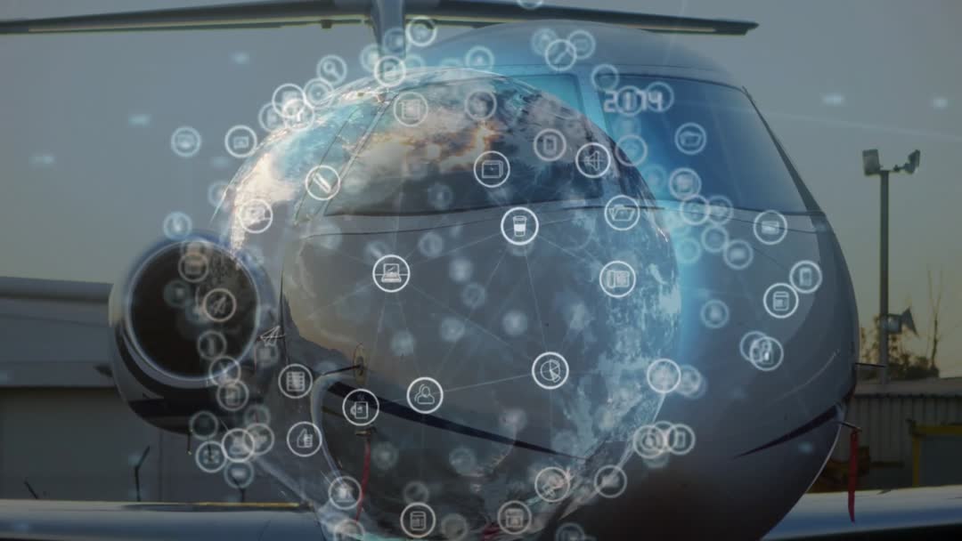 This video portrays the concept of global digital connectivity in the aviation industry, showing a translucent globe with connecting icons. Suitable for illustrating advancements in aviation technology, networking, and data sharing. Ideal for use in articles, presentations, or websites focusing on technology in aviation and global communication.