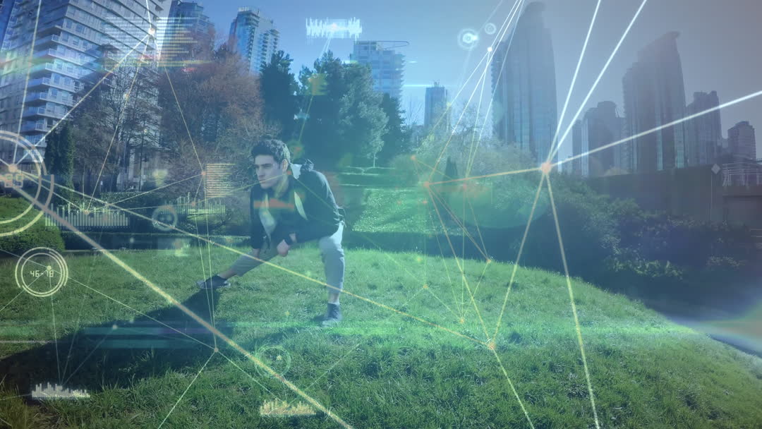 In a city park, a caucasian man engages in stretching, surrounded by digital data overlays and connections. This video epitomizes the blend of active lifestyle and technological innovation. Ideal for illustrating concepts related to health and technology, cybersecurity in modern cities, or the integration of digital solutions in everyday activities.