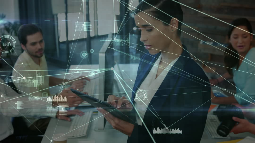 Individuals working in an office environment surrounded by digital network graphics represent the modern connected workplace. This depiction of technology integration in a professional setting is useful for illustrating themes like global connectivity, digital transformation, and teamwork. Perfect for promoting tech-driven businesses, software solutions, or collaborative working spaces.