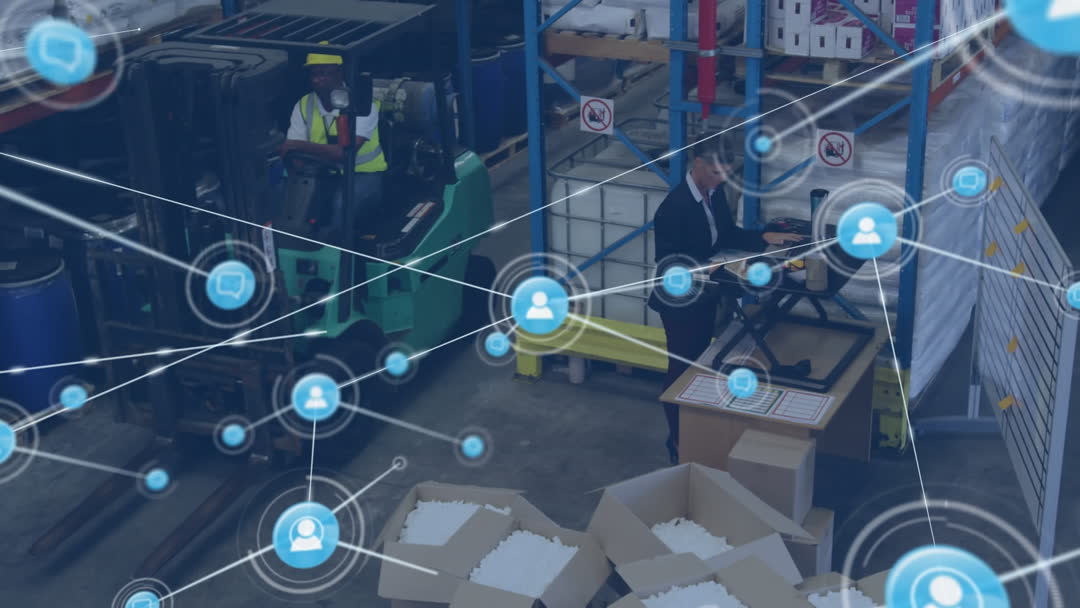 Icons connected by lines overlay a busy warehouse, highlighting digital and smart systems in modern logistics. Workers manage supplies amidst digital communication visuals, emphasizing technological integration. Suitable for illustrating industrial efficiency, interconnected logistic systems, and the future of warehouse automation.