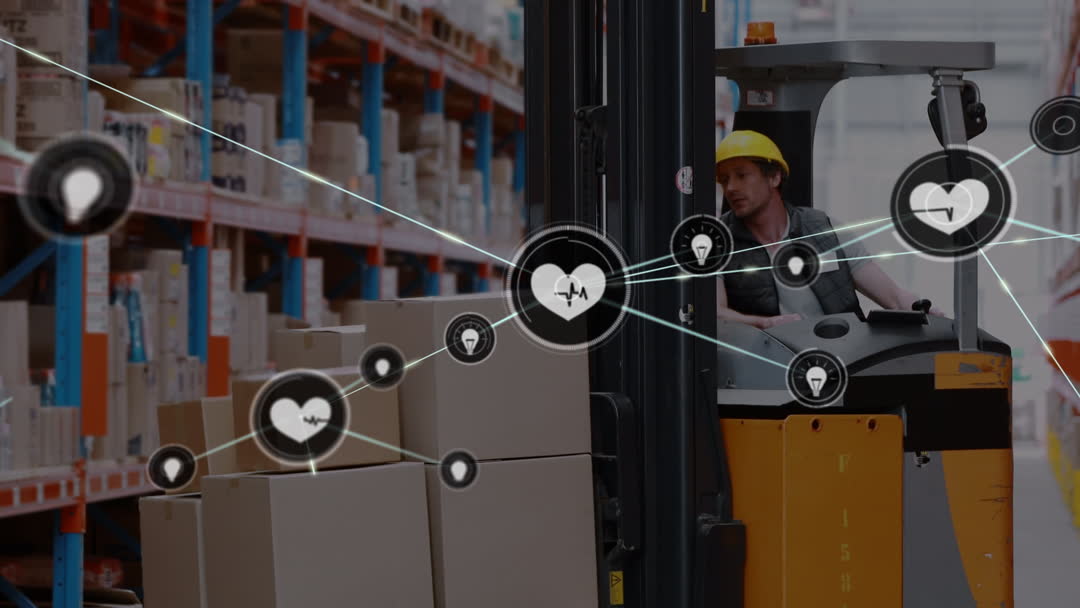 Shows a man driving a forklift with digital network graphics overlay, representing integration of technology in modern warehouses. Useful for showcasing advancements in logistics and inventory management.