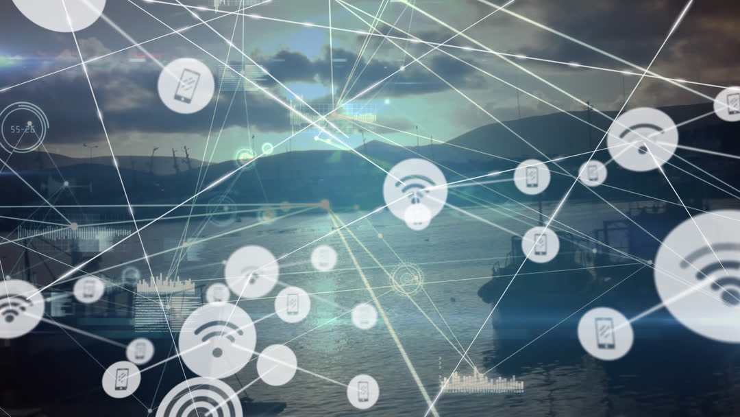 Depicts interconnected wireless icons and digital data overlay on a scenic harbor landscape, visualizing modern technology and maritime communication networks. Perfect for use in technology presentations, digital transformation visuals, or featured in articles about connectivity in industrial and natural settings.