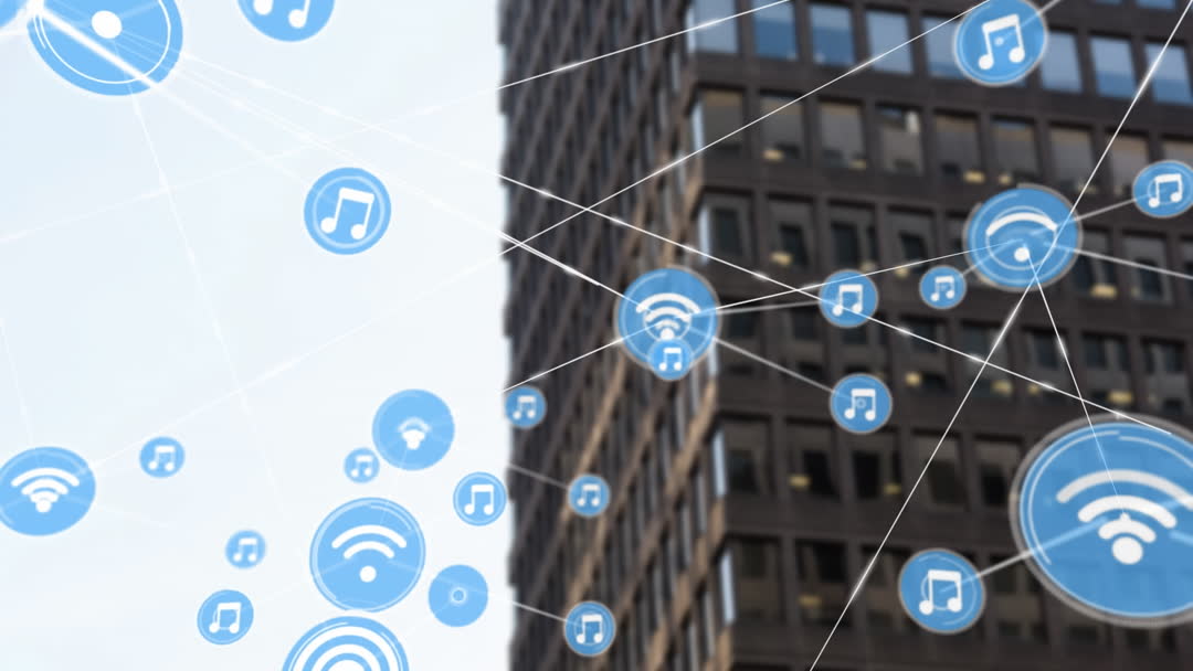 Digital connectivity is depicted with wireless network icons overlaying a modern building. This video is suitable for themes surrounding smart cities, internet of things, or digital transformation in urban environments. Ideal for use in technology articles, business presentations, and advertisements relating to advanced communications.