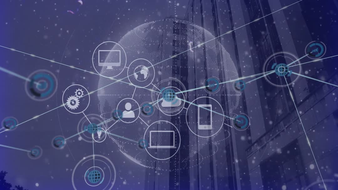 The video shows a digital network graphic overlay illustrating devices connected by lines, with a central globe under a flat-rendered facade of a modern skyscraper. This represents global digital connectivity and recognizes technological innovation in urban environments. Ideal for campaigns related to technology services, smart cities, or global connectivity solutions, emphasizing modern infrastructure's role in digital transformation.