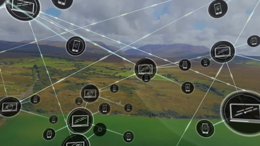Displays digital icons connected by lines over a scenic rural area, symbolizing advanced communication linking technology with natural environments. Suitable for illustrating concepts of modern technology integration, digital connectivity, or innovations in rural areas.