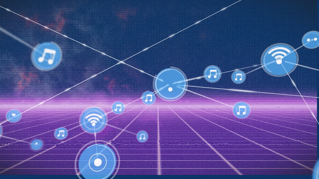 Futuristic visuals of digital connectivity with music and Wi-Fi icons suggest seamless online communication and media sharing. Perfect for illustrating online networks, digital media applications, or presentations related to music streaming technology in a modern context.