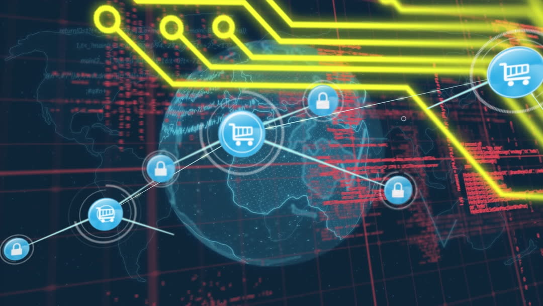 Visual depicting interconnected world with e-commerce and cybersecurity graphics, perfect for articles, presentations, or websites focusing on digital security, global online shopping, or technology strategy development. Conveys concept of secure digital transactions worldwide.