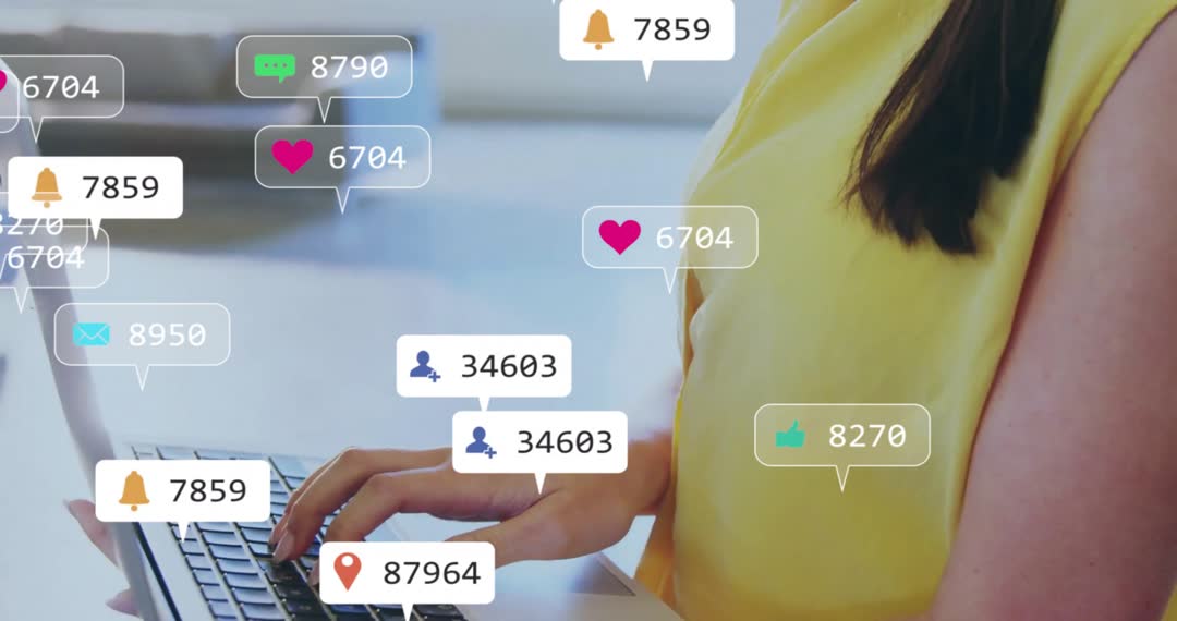 Focused on hands typing on a laptop, video's text overlays realistic social media interaction metrics, text notification aesthetics accentuating online engagement in digital marketing contexts. Use this visual in campaigns for social media analytics, enhancer tools tutorials, sharing insights about audience engagement, or showcasing networking efficiency among connected, productive multitaskers creators.