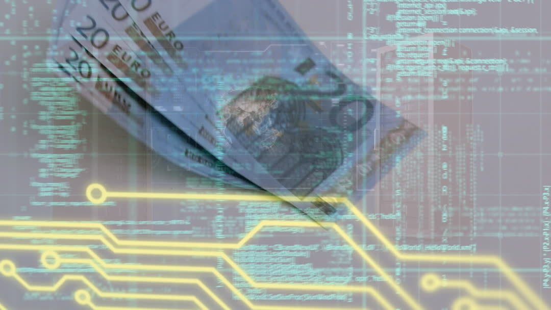 Depicting the fusion of traditional currency with digital data, this video presents a representation of euro banknotes combined with digital processing elements. Suitable for illustrating concepts related to financial technology, digital transactions, and the evolving digital economy. Useful for finance blogs, cybersecurity discussions, or technology-focused presentations highlighting economic trends.