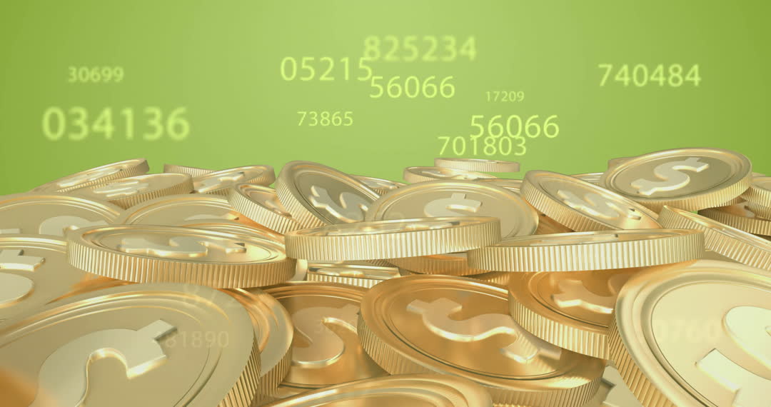 Vibrant depiction of financial growth shows gold coins beneath dynamic financial numbers on green backdrop. Perfect for illustrating financial success, currency markets, online platforms handling digital currencies, investment growth campaigns, and tech-based commerce advertising.