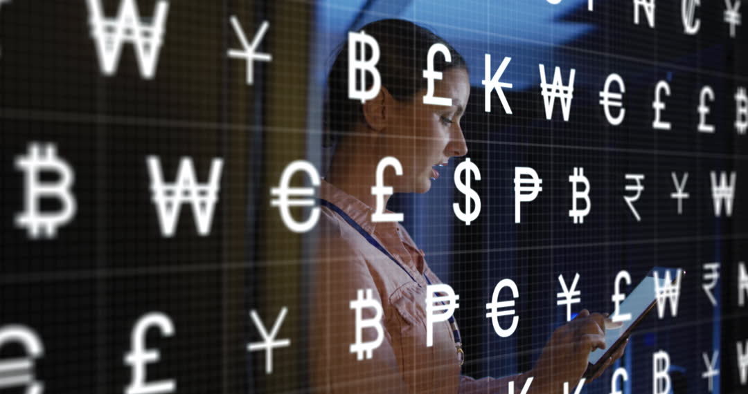 Female professional working in a server room with digital currency symbols overlay. Highlights the intersection of technology and finance. Useful for illustrating global business concepts, digital transactions, or finance technologies in articles, presentations, and advertisements.