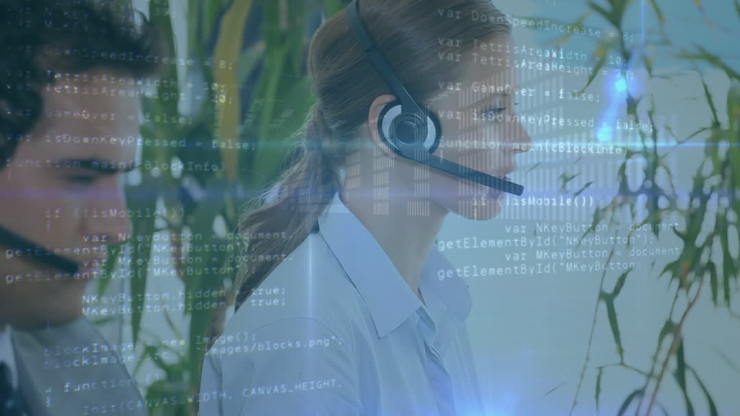 Professionals in business settings communicate with clients using phone headsets while overlaid digital data suggests high-tech interaction and insights. Ideal for illustrating modern corporate support services, technological advances in customer care, or concepts related to data analytics in professional environments.