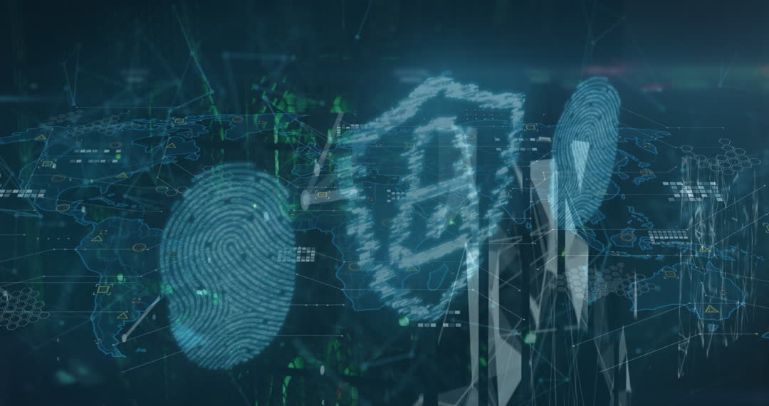 Futuristic animation illustrating concept of cybersecurity and digital protection, featuring animated shield and fingerprint icons overlaid on world map. Visualizes global network connections and data processing. Ideal for use in presentations, articles, and websites focused on cyber protection, digital security strategies, or advanced technological solutions promoting privacy and data integrity.