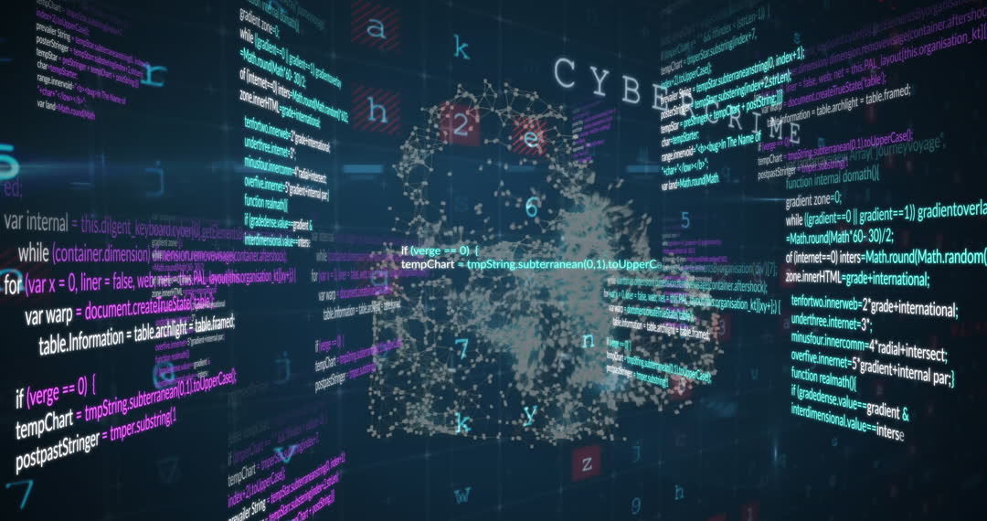 Visual representation of cybersecurity using an animated padlock surrounded by scrolling data and code. Illustrates cyber threats and data protection trends in digital technology. Useful for articles and presentations on online security, encryption techniques, and technological developments in cybersecurity.