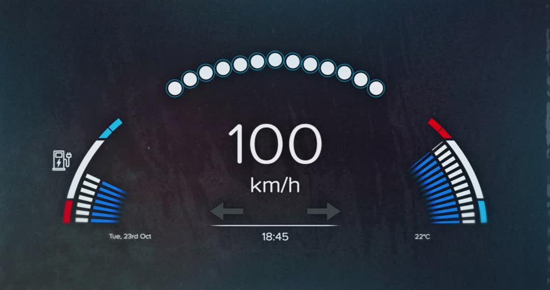 Digital dashboard interface illustrates a sleek and modern vehicle technology display. Speedometer shows 100 km/h with dynamic animation revealing various gauges, including fuel indicators on sides. Useful for emphasizing advancements in automotive technology, electronic displays, modern vehicular design. Suitable for illustrating a future-focused concept in transport industry presentations or automotive blogs discussing electronic features in cars.