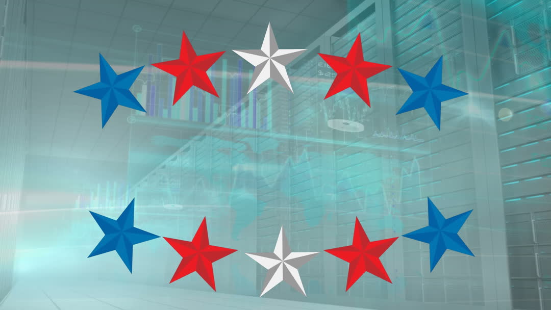 Animated graphics showing digital stars overlay on a technological server room. Suitable for illustrating concepts related to digital data processing, financial analysis, or advancements in technology for retail and sales sectors. Can be used in IT infrastructure presentations or digital marketing for tech-savvy audiences.