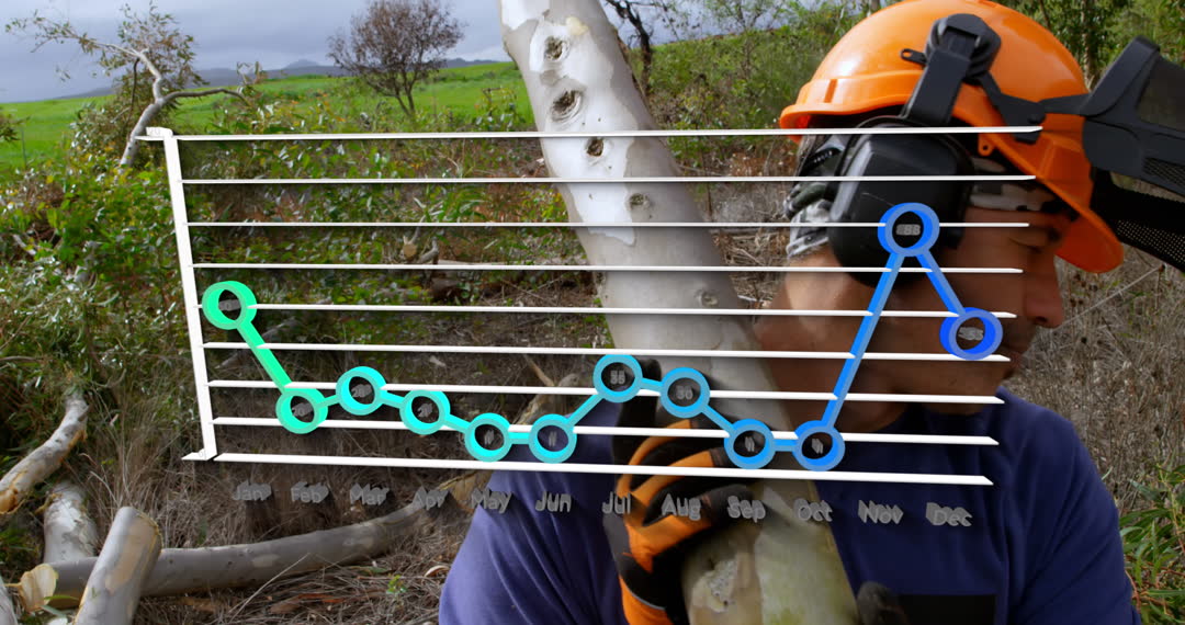 Visual of a logger wearing safety gear and interacting with digital data overlays in a forested area. The combination of natural elements and data charts illustrates the intersection of technology and environmental work. Ideal for themes such as environmental research, technology in forestry, and data analysis in natural sciences.