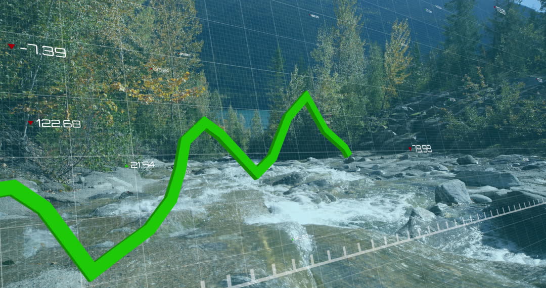 Conceptual illustration featuring green analytics graph superimposed on serene forest stream, showcasing the blend of technology and nature. Useful for articles or presentations on environmental technology, data analytics in natural settings, or investment trends related to ecological aspects.