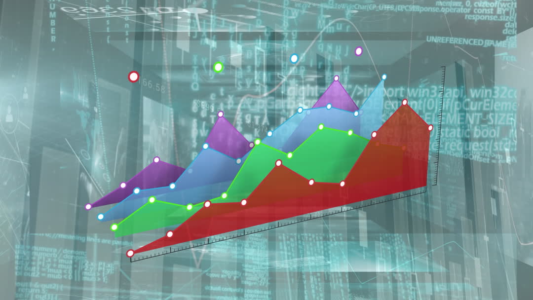 Depicts colorful 3D graph overlaid on abstract digital background, symbolizing data processing and technology integration. Suitable for exhibits on digital analytics, finance trends, tech filler content or educational materials exploring data analysis and digital tools.