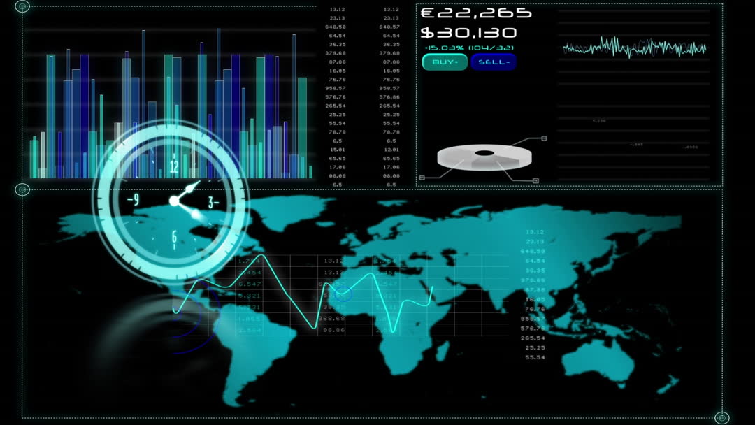 Visual embedding digital data analytics interface with fast-moving clock indicates advanced data processing and aide implications. Illustrations like graphs, currency data, and global maps suggest focus on financial trends, global computing and data. Enhances presentations geared towards tech usage or financial ventures and stock-market Analytics excellence scenes.