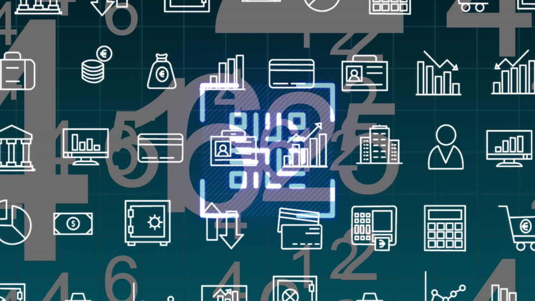 This visual shows a mix of tech and finance-themed digital icons and numbers cascading against a dark backdrop, creating a futuristic data processing concept. Useful for representing digital transformation in finance, technology advancements, or data management topics in digital content, ads, and presentations.