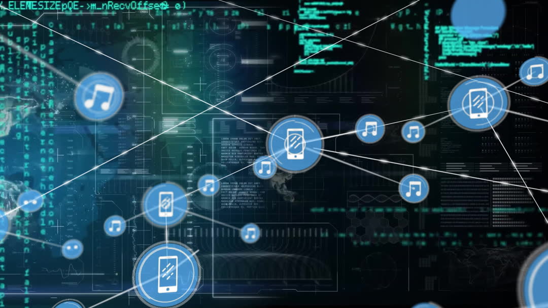 Animation shows interconnected icons of smartphones and music notes against a backdrop of data processing elements, depicting a futuristic vision of digital communication technology and global connectivity. Ideal for use in presentations or articles related to technology, data networks, digital transformation, and the music industry.