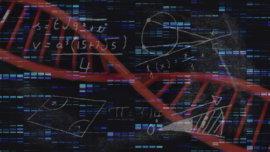 Visual represents the intersection of technology and biological data, showcasing a DNA strand with digital overlays and mathematical graphics. Useful for concepts related to biotechnology, digital analytics, scientific research, and global technological advancements in data processing fields.