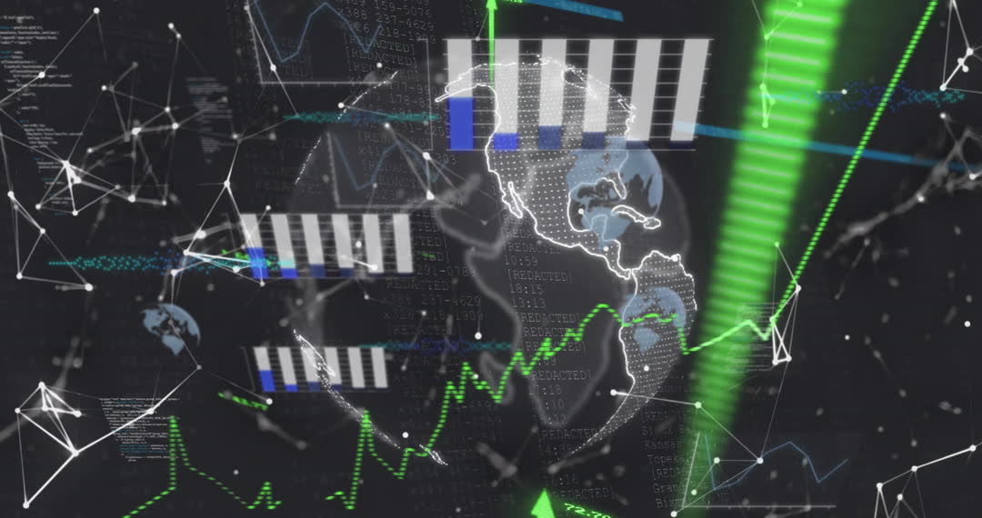 Visual displaying complex digital graphs and data overlays on a globe, symbolizing global business dynamics and technological integration. Perfect for use in presentations about finance, international markets, digital innovation, or global communications strategies.