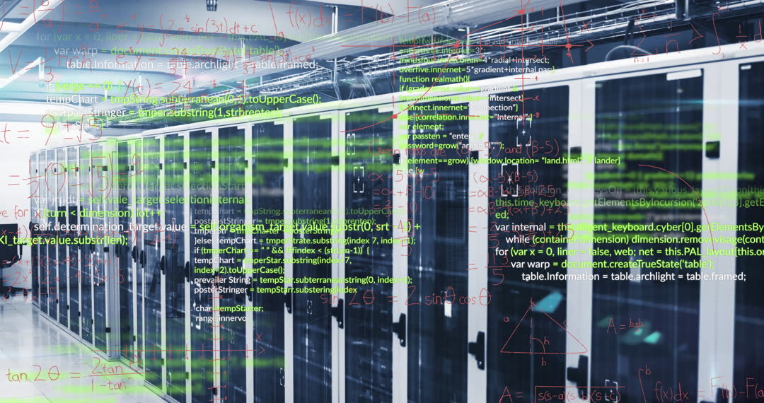 Visual depicts animated code and data processing sequences over a server room, emphasizing technology and global connectivity. Ideal for showcasing data management, digital security, IT innovations, and high-tech environments. Useful in illustrating modern data processing, data centers, and network solutions.