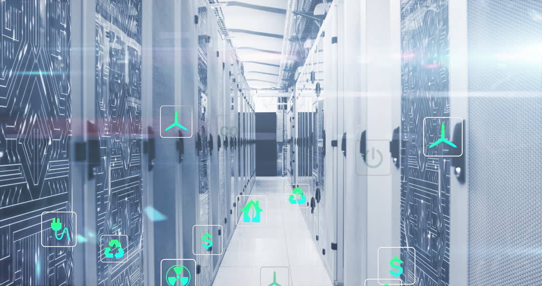 Digital data center features server racks with futuristic technology icons representing concepts like power, recycling, and environmental sustainability. Suitable for illustrating modern data systems, IT infrastructure advancements, and energy-efficient technology solutions.