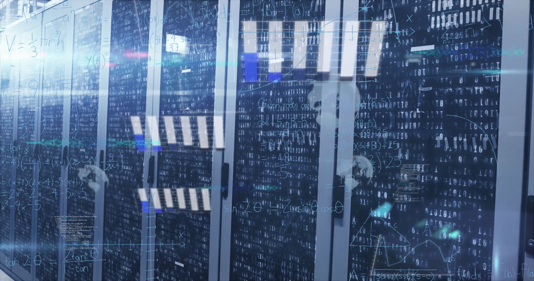 Digital data center featuring digital codes and technology-related symbols illustrated across the servers. It suggests themes of data management, network connections and technological advancement. Useful for articles and content related to global information systems, IT strategies, and data-centric operations.