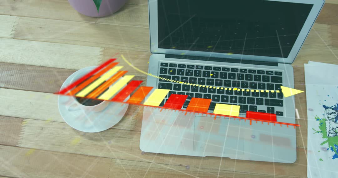 A modern workspace merging technology with real-world elements, featuring a vibrant digital graph overlay with red and yellow bars indicating data growth, placed above a laptop and coffee cup on a wooden desk. Perfect for illustrating concepts related to business analytics, data growth trends, modern technology in workspaces, and innovative visual solutions. Can be used in presentations, articles about technological integration in business, or advertisements for analytics services.