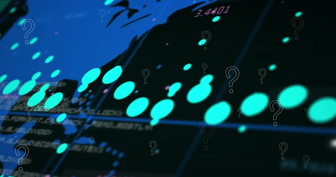 Image shows abstract data and code with glowing dots symbolizing data flow, alongside question marks possibly implying uncertainty or inquiry. Useful for illustrating concepts of data analysis, digital problem solving, or technology discussions.
