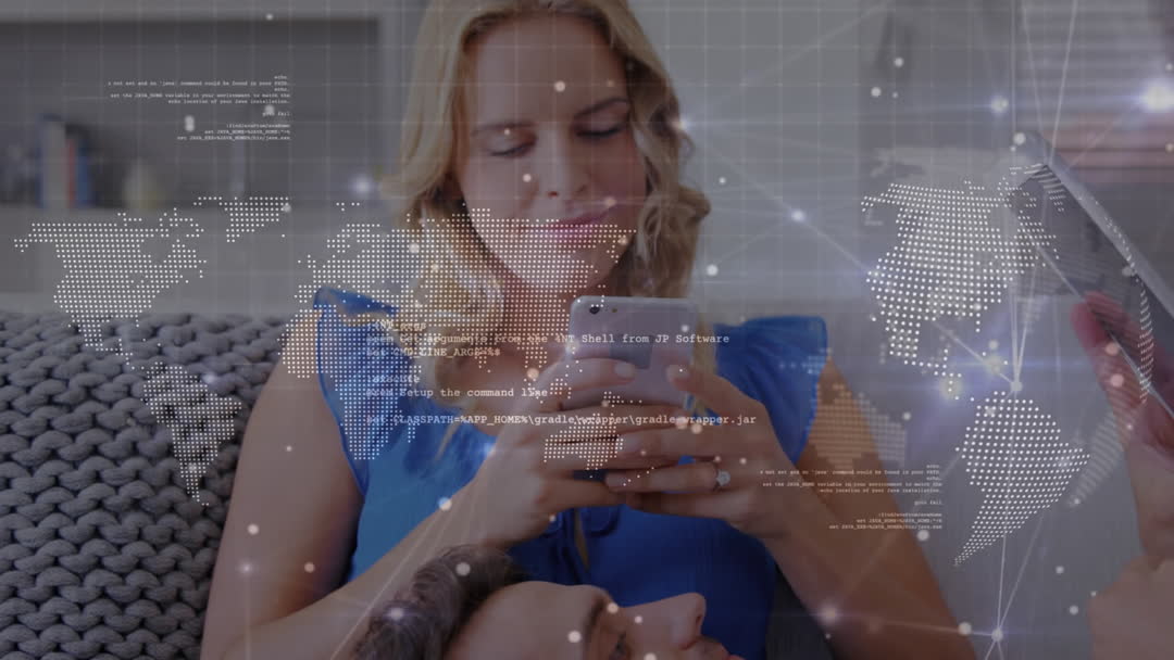 A woman is texting on a smartphone, overlaid with animated data and a world map, symbolizing technological connectivity. Ideal for illustrating themes of global communication, digital data exchange, and technology advancements. Useful for articles or presentations on digital lifestyle, tech usage, or modern communication networks.