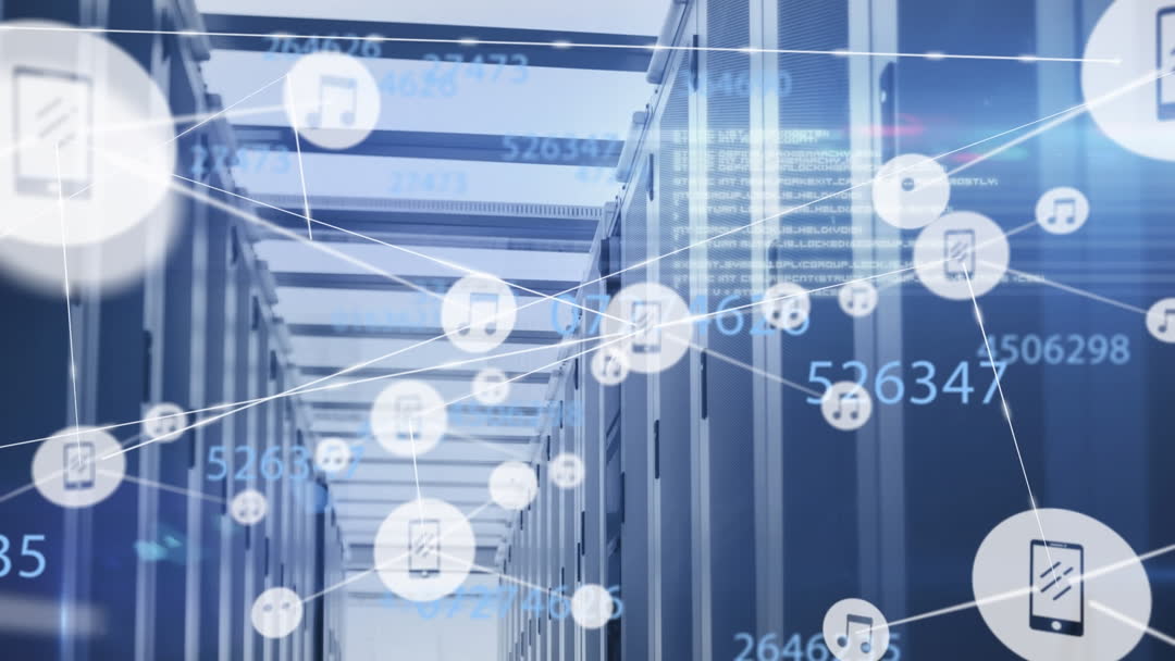 This video showcases the concept of digital data connections in a modern data center. Abstract icons representing digital data intersect over servers, illustrating themes of networking, cloud computing, financial data exchange, and technology infrastructure. This visual can enhance content related to IT infrastructure, data management solutions, modern innovations in cloud environments, and advancements in data processing technology.