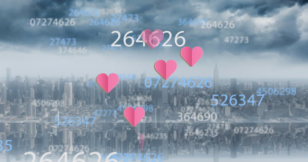 Overlay showing flowing numbers and hearts symbolizes integration of technology with urban life and business engagement trends. Suitable for use in presentations on data analysis, digital interactions, corporate strategies, and modern city living.