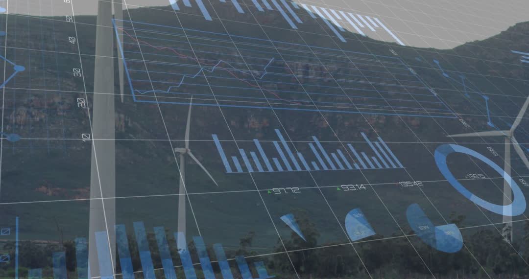 A digital blend of overlaid graphs and charts with wind turbines creating a futuristic and tech-forward scene. Represents digital transformation in renewable energy and data analysis in business contexts. Useful for illustrating environmental technology trends, sustainability reports, and articles discussing advancements in clean energy systems.